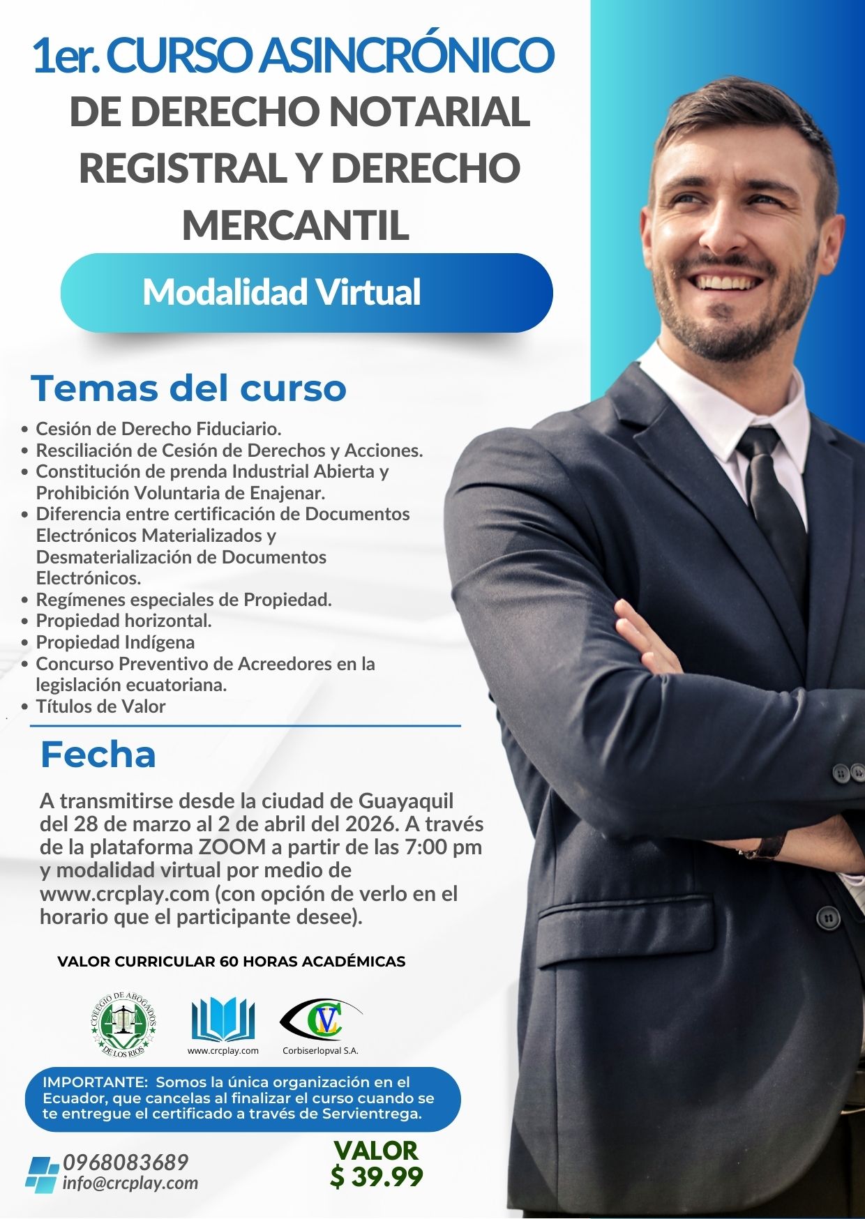 EL VALOR DEL CURSO ES DE 29.99 DOLARES. RECUERDA: Somos la única organización en el Ecuador, que cancelas al finalizar el curso cuando se te entregue el certificado a través de Servientrega, no pierdas está gran oportunidad!.